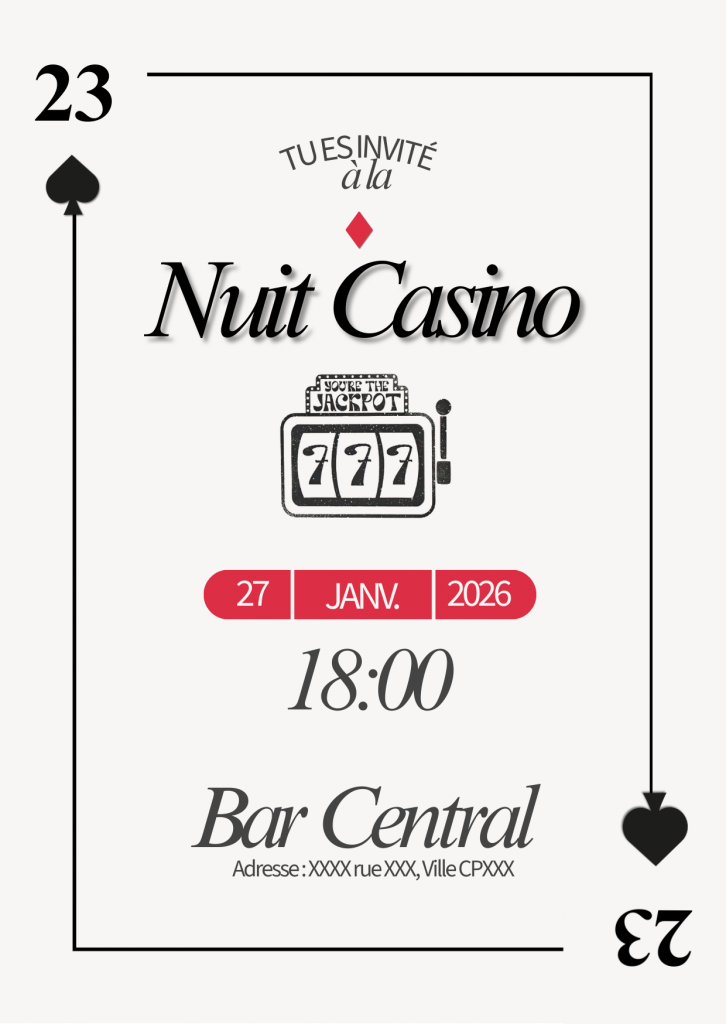Tout commence par l’invitation. Pour annoncer la couleur (et le dress code !), téléchargez notre Template d’Invitation Nuit Casino.