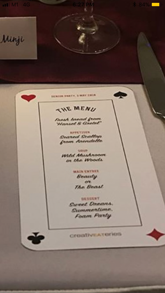 Le design : Imprimez votre menu sur du papier épais au format rectangulaire avec des coins arrondis. Ajoutez un symbole (cœur ou pique) dans les coins pour imiter une carte géante.