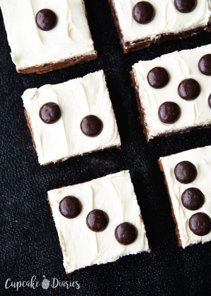 Ingrédients : Votre recette de brownie préférée (chocolat noir, beurre, sucre, œufs, farine), glaçage blanc (sucre glace + eau ou chocolat blanc fondu), pépites de chocolat géantes ou billes en chocolat.