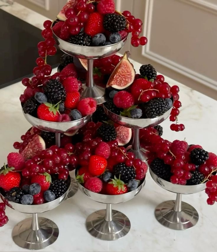 Pour rafraîchir le tout, servez des salades de fruits rouges (fraises, framboises, mûres) présentées dans des verres à Martini ou des coupes à champagne argentées pour un look très « Gatsby ».